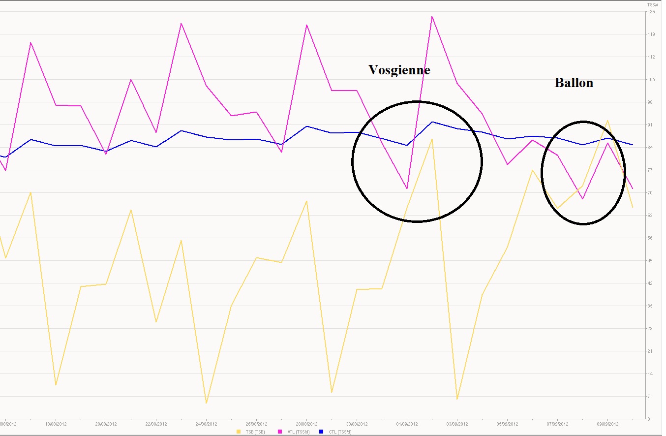 Une semaine après la Vosgienne, je m’aligne après avoir réalisé une semaine light. Comme on peut le voir sur mon graphique de charge ( en rouge) et stress Balance ( en jaune), j’ai réalisé une bonne semaine d’affutage avec seulement 3h30 de vélo orienté un poil rappel intensif. Les courbes se sont bien croisées espérant ainsi déclencher un pic de forme après un mois d’Aout assez lourd de préparation. Idéalement j’essaye de reproduire le modèle de 2010 où j’ai littéralement explosé suite à la Vosgienne 2010 en prenant 10 w au seuil en une semaine !