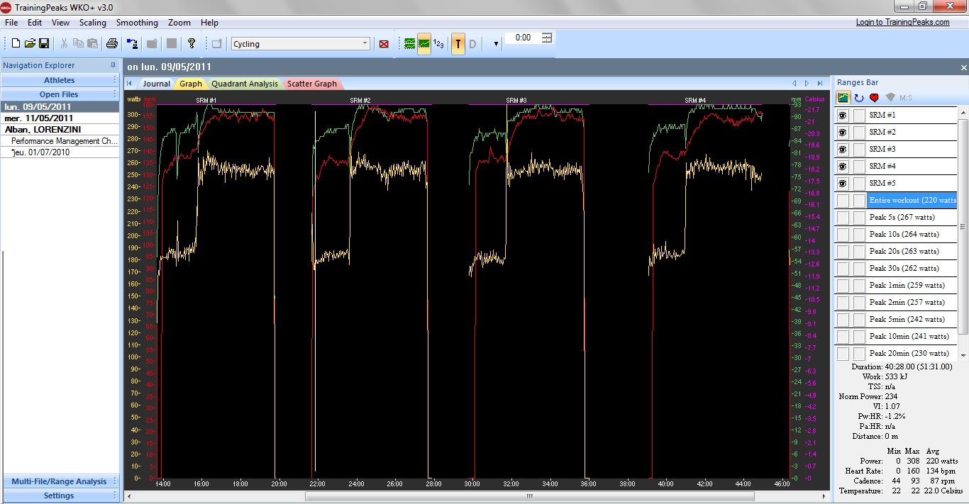 Je voulais savoir depuis un moment ce que pouvait vraiment apporter un gain de poids et un rapprochement par rapport à l’axe de pédalage. Ces 2 paires proposant vraiment des différences importantes, il me semblait intéressant de tenter une étude.. Je choisis le protocole suivant : 2 jours d’essai avec 2 alternances pour chaque modèle de 4 min @250 watts sur HT. A 250 watts, je suis en zone I3 me permettant d’avoir déjà une certaine puissance sans m’épuiser pendant tous ces intervalles. La moyenne des puissances par rapport à la Fc me permettra de déterminer l’efficacité des chaussures, enfin je l’espère ! Les pédales sont des Time Iclic Après un échauffement progressif de 160 à 260 w sur 15 min, je me repose 3 min puis j’attaque avec les Time. J’arrête ensuite pendant 2 min le temps de changer la hauteur de selle et de chaussures. Je recommence avec les Spe. Puis rebelote pour un nouveau test des 2 chaussures. Le lendemain je recommence mais cette fois en commençant par les Spe.