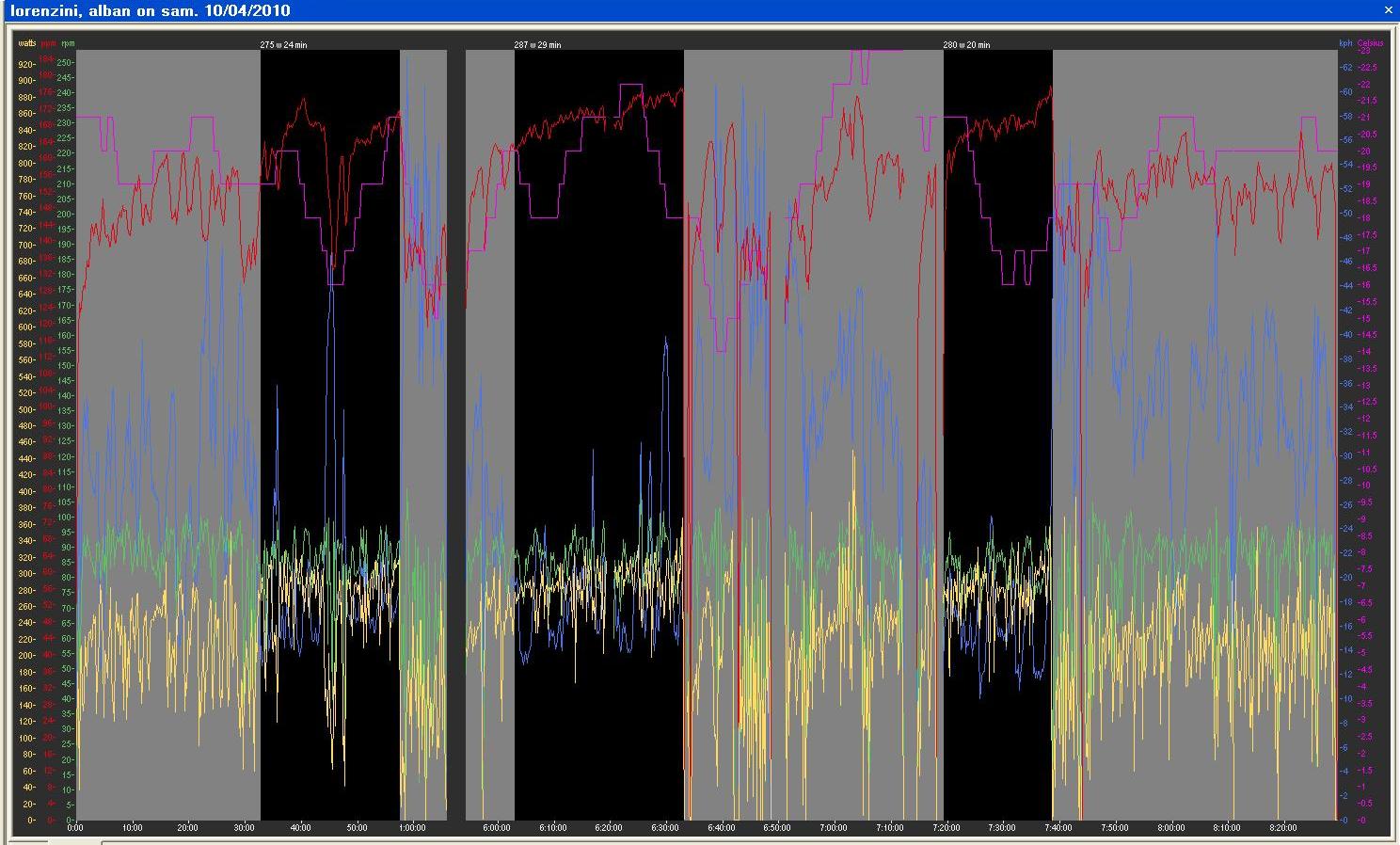 On peut donc voir ici un enchainement de 6 x ( 3’@230w+2.5’@280-300w+30’’maxi) : zone ftp+puissance maxi en fin + recup incomplète.