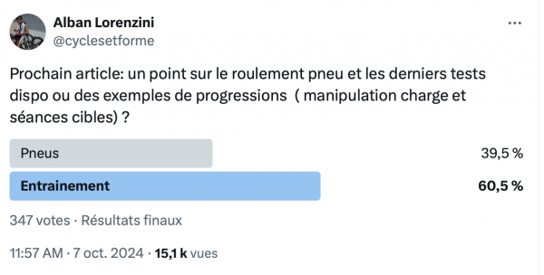 Le sondage sur X a donné l’avantage des votes à la rédaction d’un article sur l’entrainement et des exemples de progressions sur 2024. Vous avez été nombreux à participer, un grand merci. Il sera suivi dans un deuxième temps dans un article sur les pneus.