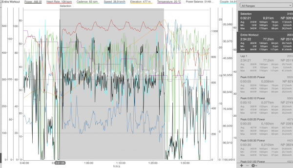 Au niveau référence d’une sortie optimisée, on arrive avec des coureurs qui ont l’habitude à faire de la qualité sur 2H30 comme ci-dessous avec quasi 0 % de roue libre et 80 % de la sortie qui évolue sur 30w de la Z2 définie ( 190/220w) . Pourtant si on regarde la courbe jaune orangé qui représente le profil, on peut voir qu’on est loin d’avoir un parcours plat.