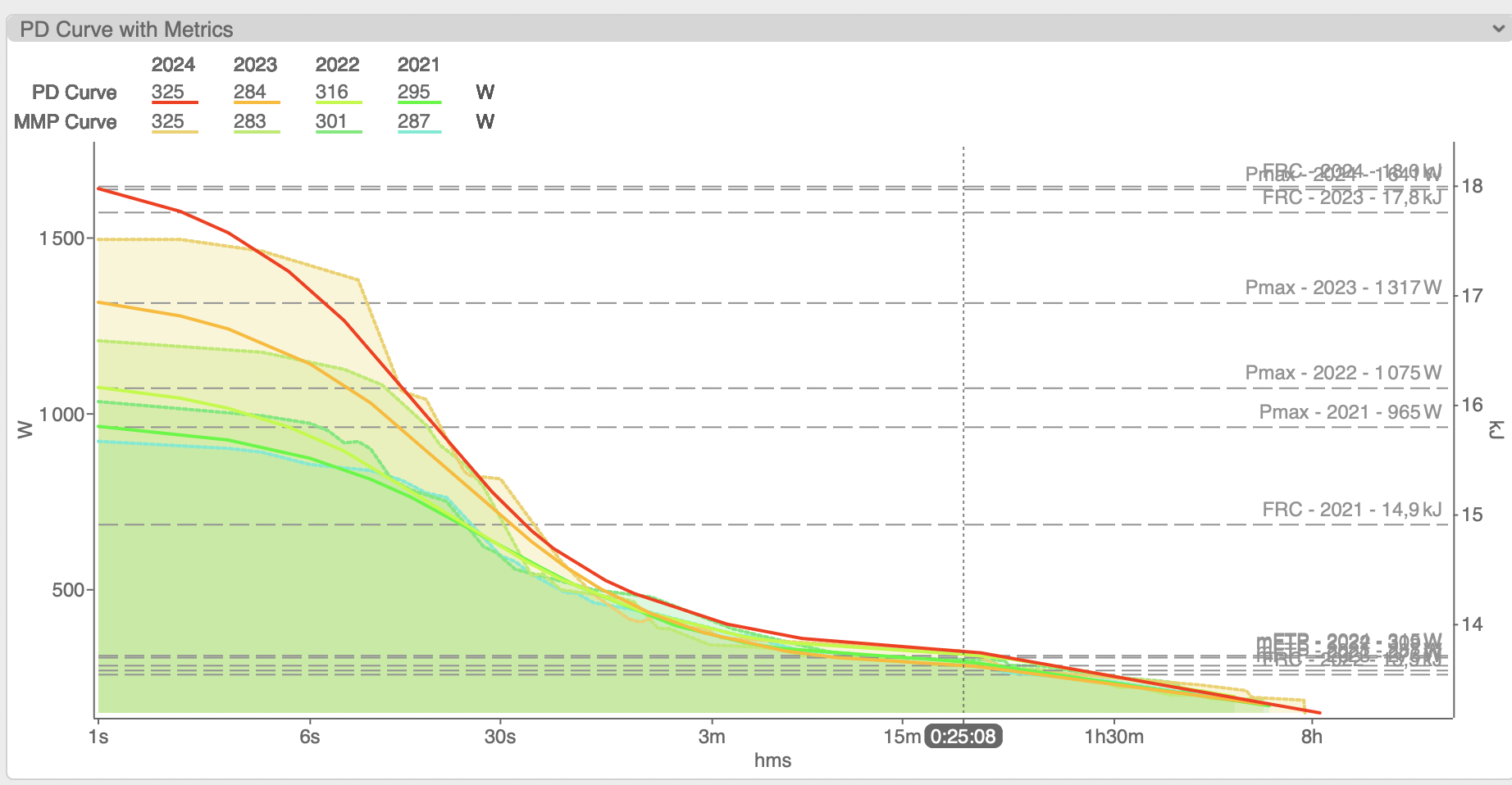 Il est certainement possible que pour booster 2025 et tenter de continuer de progresser sans avoir plus de disponibilité, la zone d’endurance haut  et de tempo bas soit encore un peu plus travaillée avant d’aller chercher plus haut en intensité. Cela permettra d’avoir un effet sur la charge globale lors de la préparation hivernal tout en essayant de ne pas générer trop de fatigue. Une autre piste sera possiblement d’aller chercher quelques gains par la haute intensité par le concept du cumul de temps sur les séries FTP et PMA que nous avons abordé mais pas totalement épuisé ( prudence la première année) .