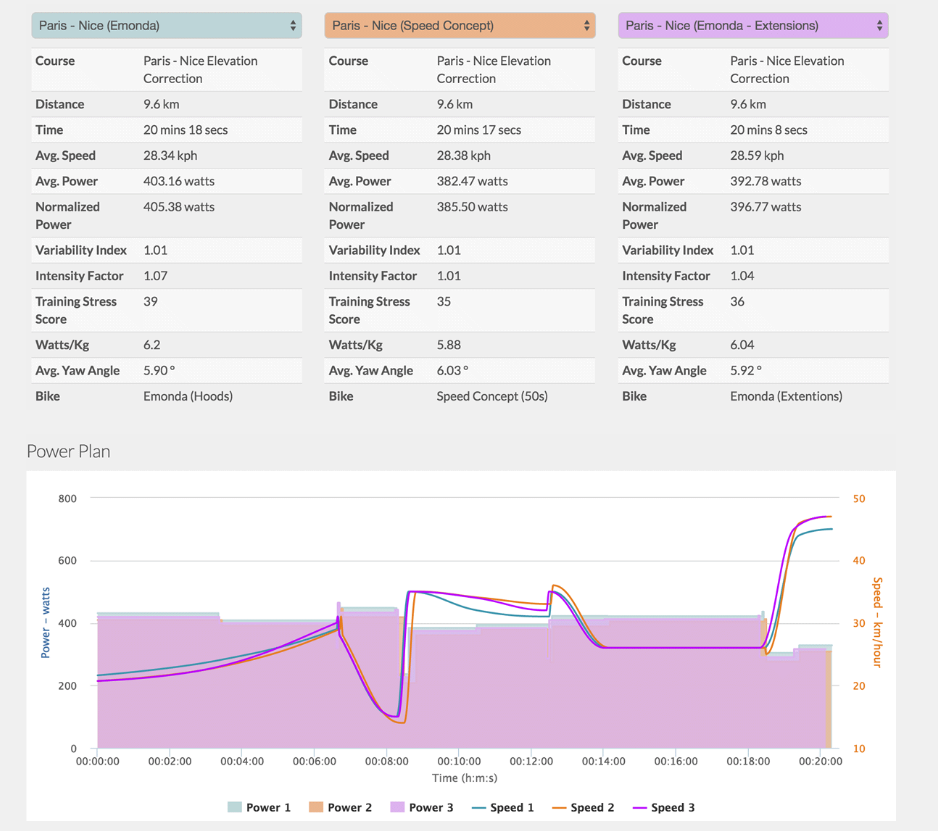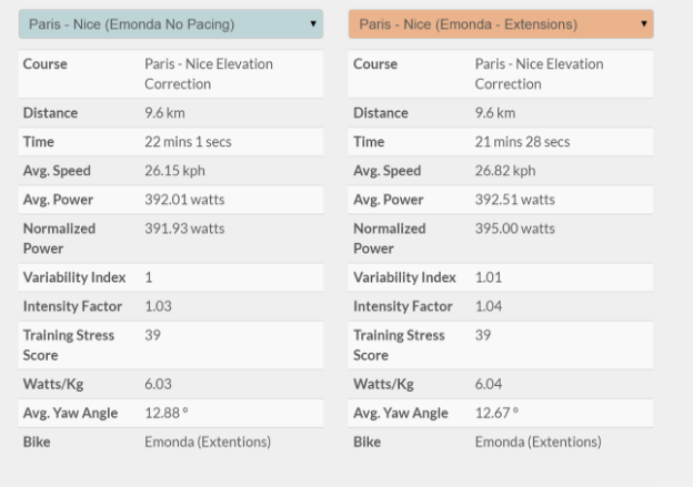 Normal qu'il y ait dans cet exemple 20w à l'avantage du velo de chrono Trek speed concept dans le col d'Eze car sur les 9,5km il y a 6,5km faciles entre 1 et 5% pour seulement 3km durs entre 7 et 8,5%, donc plus des 2 tiers du parcours qui permet une vitesse élevée donc au bénéfice de l'aéro. Maintenant si vous inversiez le profil de ce col avec seulement 3km entre 1 et 5% et 6,5km entre 7 et 8%, avec plus de 2 tiers du parcours à basse vitesse l'aero ne joue pratiquement plus et c'est la grosse différence de poids de -1,5kg au bénéfice de l'Emonda qui prendra le dessus dans ce cas.
