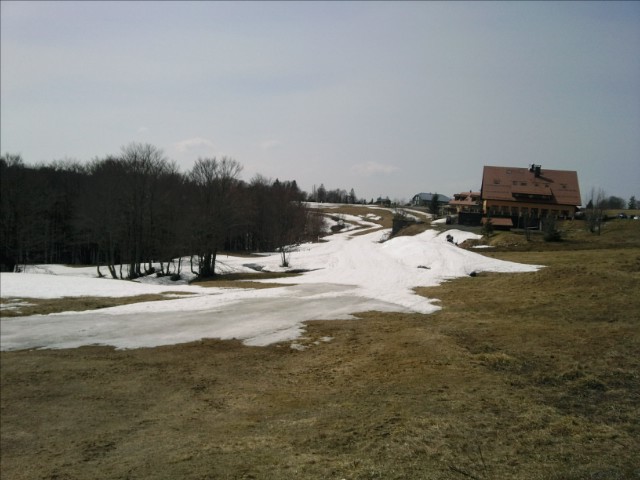 L’attaque après Saint Amarin est radicale : debout sur mon 34*27 à 300 w, je dépasse pas 9 km/h et 60 tr/min dans une pente de folie. Pas pire quand les jambes ne répondent plus et la Fc ne décolle vraiment plus. Cette fois ça y est je sais que je vais passer un mauvais moment. Je repense à ma prépa alimentaire des jours précédents et me dis que j’ai vu un peu juste avec surtout beaucoup de travaux dans la maison réalisés la veille et le matin même. J’aurai du faire des stocks de glycogène plus important et j’étais en train de payer la tondeuse, le ponçage du mobilier de jardin, la mise en peinture avant de partir bref le cumul !! comment ça je suis pas SUPERMAN ??!!. Je m’avale alors un gel Guarana me redonnant un coup de boost et permettant de franchir le premier palier @270w pendant 17 min. Par contre pas de miracle l’effort est tout de même pénible et après une courte descente, la route s’élève de plus belle tout en se dégradant. 10 % à gérer avec des trous de partout quand on n’a plus rien dans les chaussettes c’est dur. Plusieurs fois je trouve un prétexte photo pour m’arrêter et reprendre un peu de souffle. Mais rien à faire plus moyen de dépasser 250 w. C’est la misère, la déception, je suis à peine à 3 h d’effort et je n’avance plus. Heureusement le paysage encore enneigé et le dôme magistral du Grand Ballon compense un peu.
