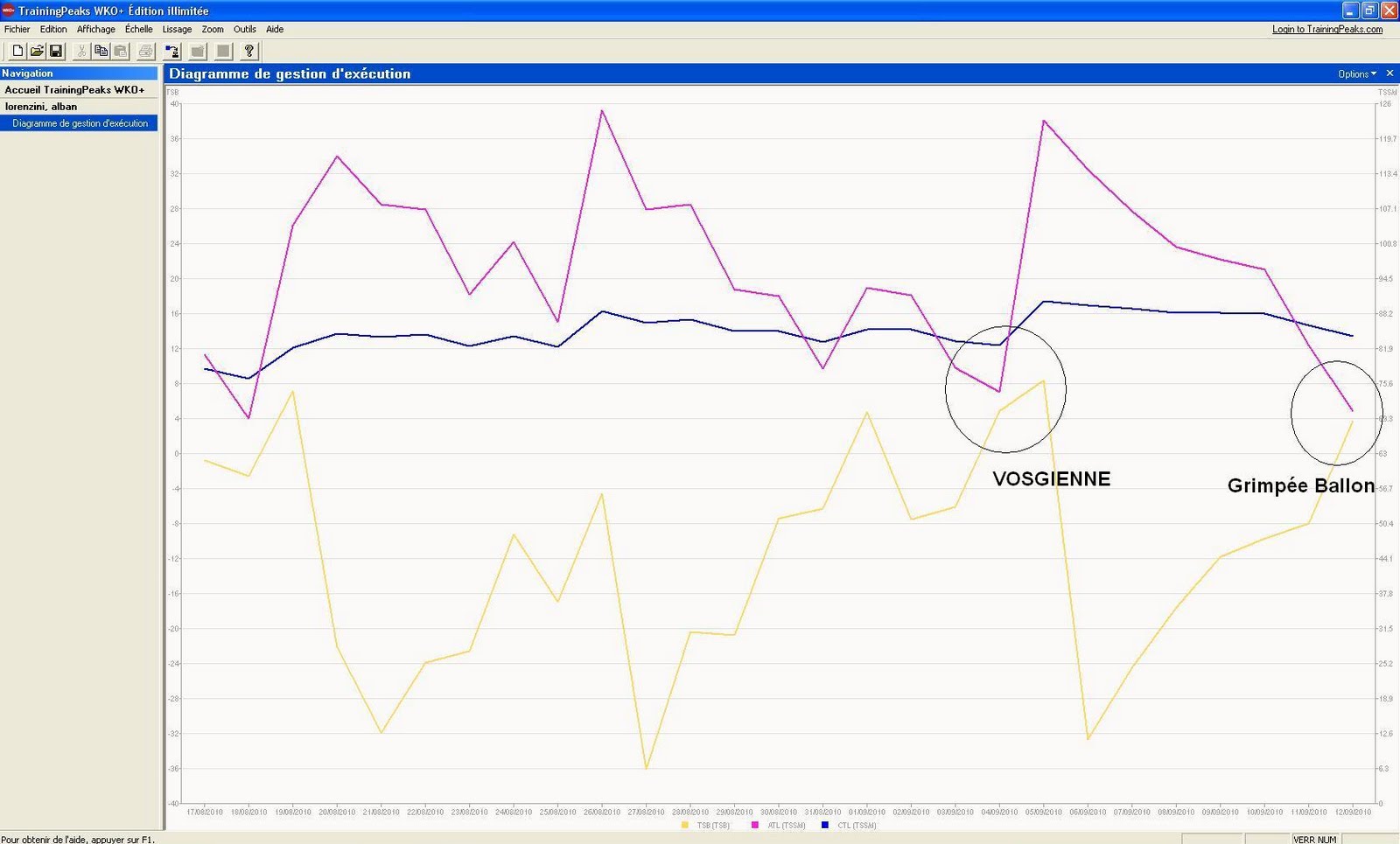 Hier j’ai donc participé à la 8 éme édition des grimpées du Ballon D’Alsace organisé par le Cyclo club des Ballons. Cette épreuve constituait le dernier objectif majeur de ma saison. La météo étant en plus de la partie, j’avais vraiment à cœur de finir en beautée. Depuis la Vosgienne de la semaine dernière et aidé par le graphique de charge du SRM, j’ai fait une semaine light afin de faire du jus comme on dit. Avec l’habitude, j’arrive maintenant à bien superposer une stress balance revenue juste positive et avec une charge d’entraînement descendante pour la date de l’épreuve.