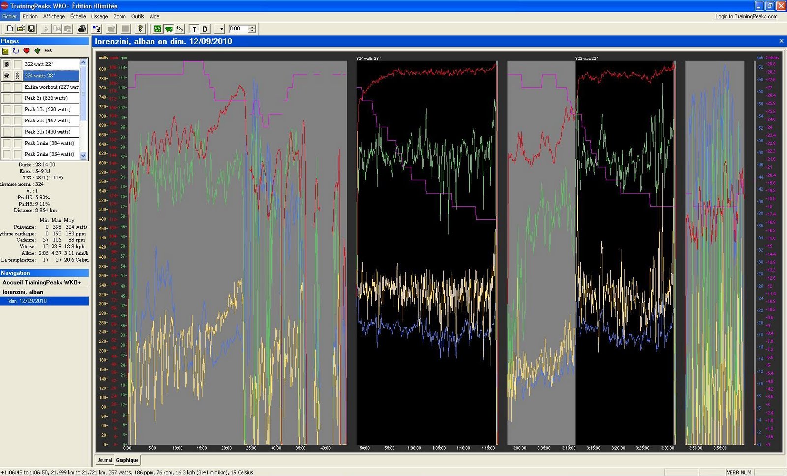 Le rêve continu puisqu’il n’y aura que Manu Poulet de mon club qui fera mieux en me repoussant à la 3 eme place scratch! L’analyse des courbes confirme cette perf avec un stratosphérique 324 watts maintenu! Avec 62.5 kg au matin me voici avec un magnifique 5.2 w/kg sur CP 28. Les 20 premières minutes se sont passée à 327 watts moyen voila de quoi estimer un bon 330 watts possible sur un test CP20. Cela me permet ainsi d’évaluer ma nouvelle FTP ( cp60) autour de 315 watts certainement. Lors de la 2 ème épreuve de course en ligne je maintiens 325 watts NP sur 20 min permettant de prendre la 5 ème place. Peut de perte de puissance entre les 2 courses espacées d’une heure, la FTP de 315 watts semble valide.