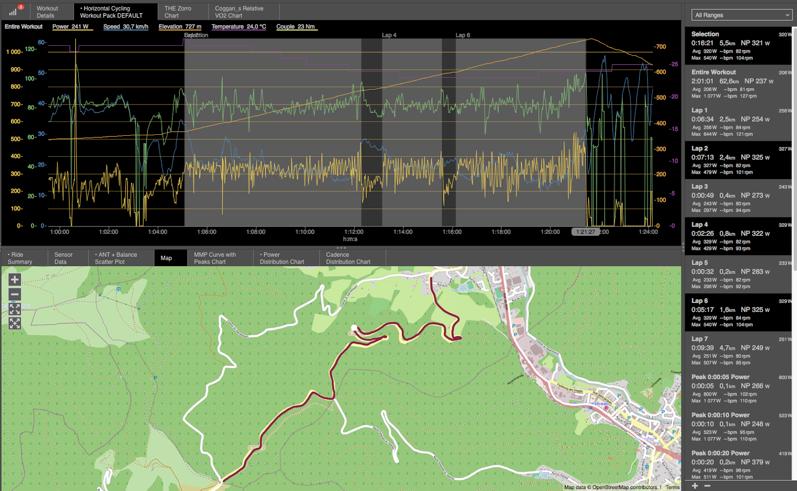 3 parties avec 2 récupérations d’environ 40 s là où se trouve les replats. Pour faire  320 w moy, j’ai opté pour 7 min ’15 s à 327