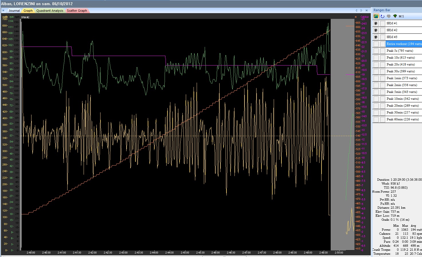 Oui en effet j'ai même pas attendu la première minute pour savoir que ça serait pas un grand jour. Dès l'échauffement j'avais pas de sensations. On dirait que mon corps n'a pas aimé la baisse brutale de charge…où que j'ai laissé du jus à combattre la crêve en continuant de m’entraîner. L'un dans l'autre j’étais malade au mauvais moment par rapport à cette grimpée. J'établis tout de même ma meilleure puissance sur 10 min pour 2012 mais on est loin de 2010. Je me pose des questions sur le poids de forme et finalement mes rhumes à répétitions qui m'ont assez pollués cette année. A économiser les 0.5 kg de trop, la progression en est limitée par un bilan hormonale pas favorable à la progression…