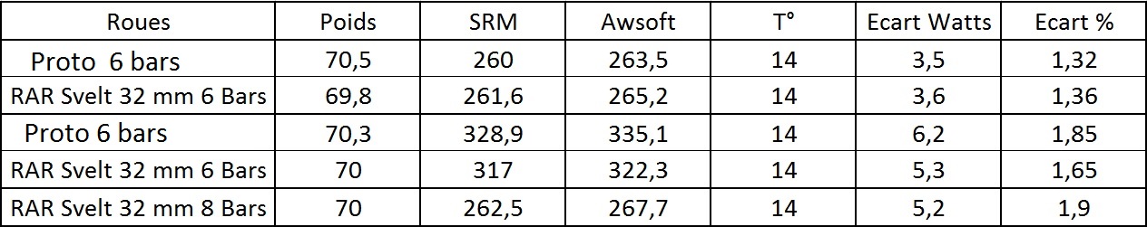 • Si elles font le même poids, elles monteront à l'identique, l'aéro ne joue pas jusqu'a 30 km/H où on observe à peine 1 watt entre une zipp 808 et roue plate…par contre si elles sont montées en boyaux alors oui elles vont perdre des watts face à mes protos! 🙂
