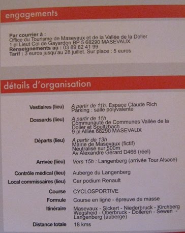 Pour 3 euros, on a le droit à un dossard, une route fermée dans Masevaux et sur la montée du Ballon ( sens montée), classement et récompenses pour chaque catégorie comme sur les cyclos à 30 euros. Alors je fais un peu de pub à travers mon blog, venez nombreux ça devrait être sympa ! En plus le coté Alsacien de la montée( sur les 3 possibles) du Ballon avec ses magnifiques lacets en pierre au pied du Lac d’Alfed est vraiment la plus belle pour ceux qui connaissent pas.