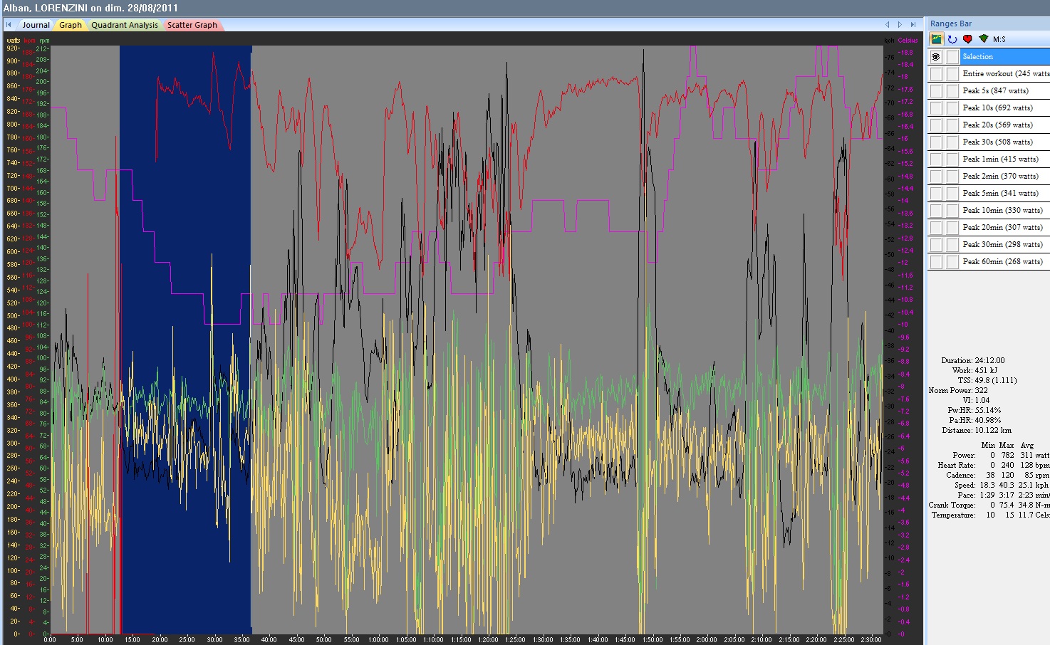 Belle satisfaction donc avec une bonne capacité à suivre les meilleurs maintenant sur les premières parties. Manque encore 20 watts je pense pour résister d’avantage aux accélérations qui font bien mal. Ça risque d’être dur, je sens que j’exploite pas loin de mon maximum avec 370 watts de PMA et 330 watts au seuil 20 minutes. Cela représente déjà 90 % d’exploitation de la PMA mais il semble possible d’en tirer 95 % soit 350 watts. A voir si pour l’édition 2013 je peux encore un peu évoluer…Une chose est sur il me faudra certainement passer par plus de compétitions de ce genre pour encore progresser. Quand je vois ma répartition des puissances sur cette édition avec plus de 30 minutes passées entre 350 et 470 watts, c’est 50 % de plus qu’à l’entrainement sur les mêmes durées. Ça aide pour passer un cap !
