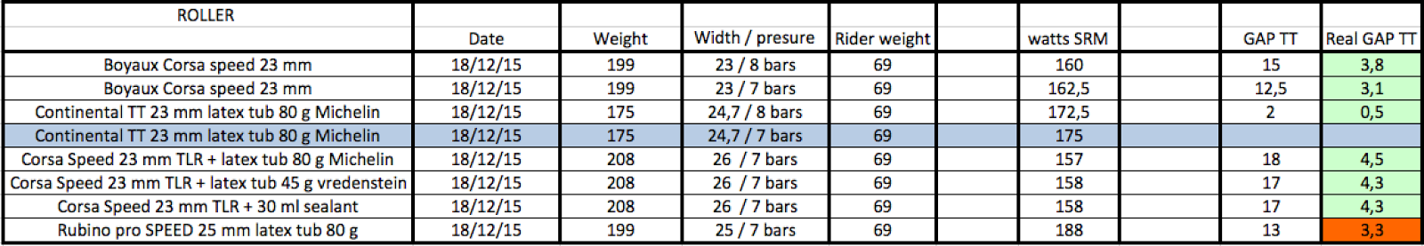 tab below. Green case show saving watts by Vittoria Vs TT and red case show