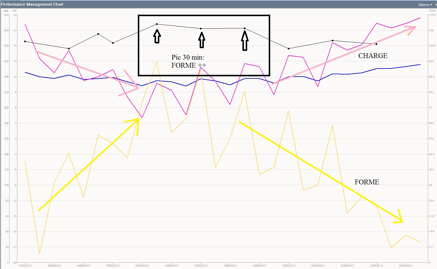 on voit que j’ai levé une première fois le pied à l’approche du 15 aout pour le critérium du Ballon. La charge en rose à baissée, la forme en jaune est montée,