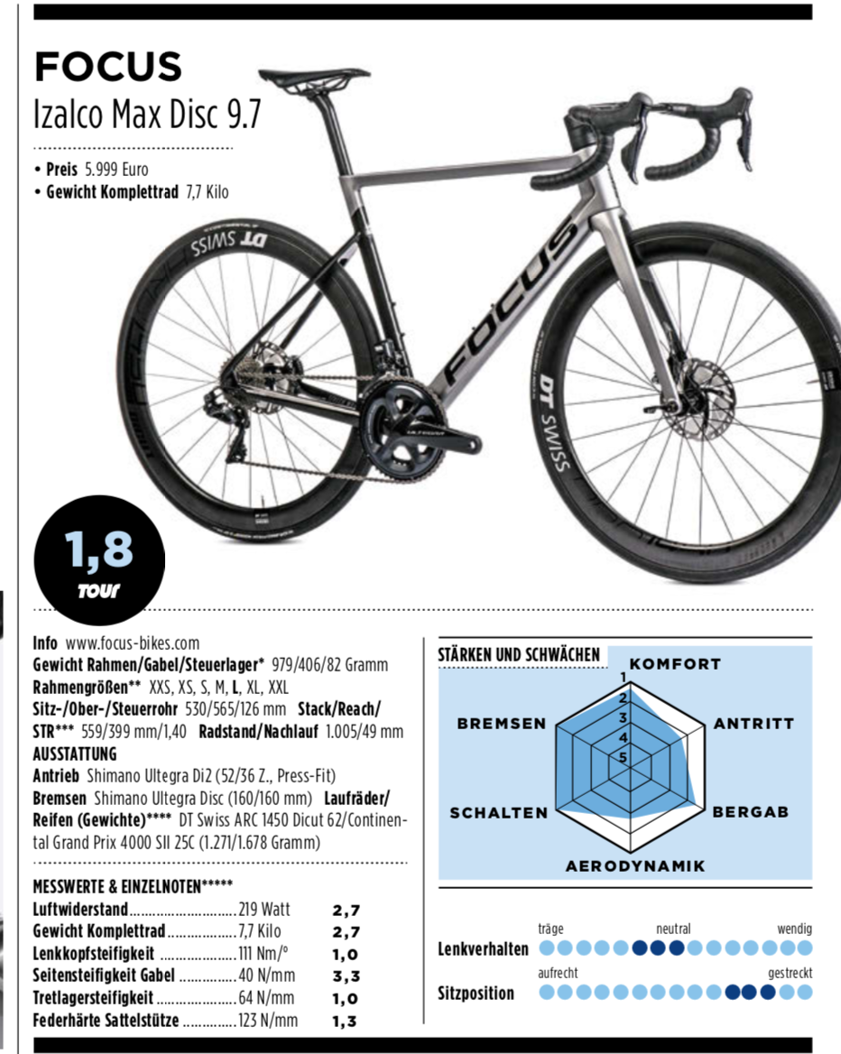 Actuellement en focus izalco team SL ultégra de 2014 (1500€ neuf !) équipé en FFWD 60mm (boyaux conti sprinter) et prolongateur, je me lance sur le frenchman XXL après quelques années de FFC. Je trouve ce vélo très nerveux et confortable mais pas rigide du tout ! (alors que je suis pur rouleur …)