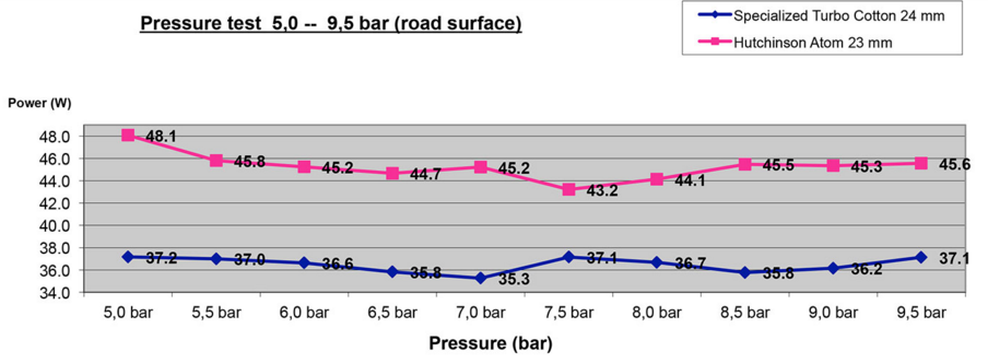 1, 3 watts pour le pneu Spécialized en passant de 6 à 7 bars puis se dégradait entre