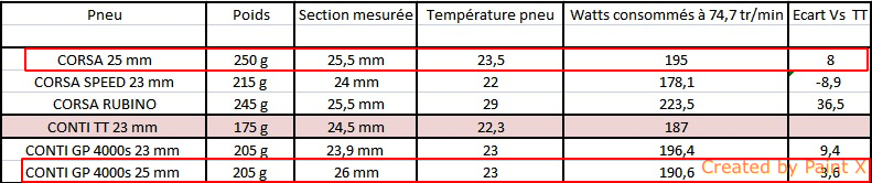 coté. Le TT était plus rapide de 4 watts vs le  GP4000S 2 et 8 watts vs le Corsa, il semblerait donc que diviser par 4 mes résultats entre les pneus