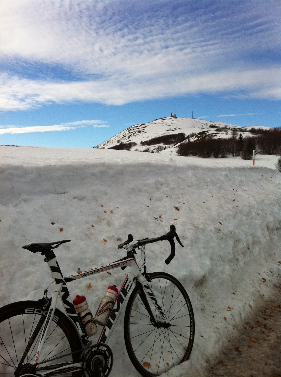 A l’attaque je vise 300w mais rapidement un bon mal de jambes de ma montée en force me rappel à l’ordre. J’ai pas encore l’endurance de force des grands jours. Je me cale @270w et ça passe bien mieux. Les 2 derniers km sont pénibles, il y a pas mal de gravillons sur la route, heureusement il n’y a pas de neige sur la route. Au sommet c’est magnifique, la douceur du jour fait contraste avec les paysages enneigés.