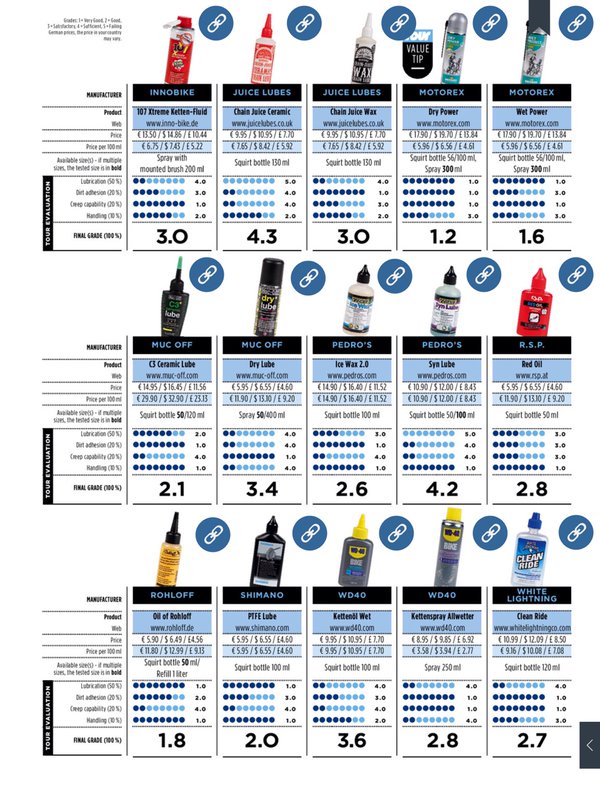 Pour en revenir aux lubrifiants, le magasine Tour a testé d’autres produits pour 2016 mais le Muc off Hydrodynamic n’y apparaît encore pas. Aucune idée pour savoir si leur sélection est plus performante…