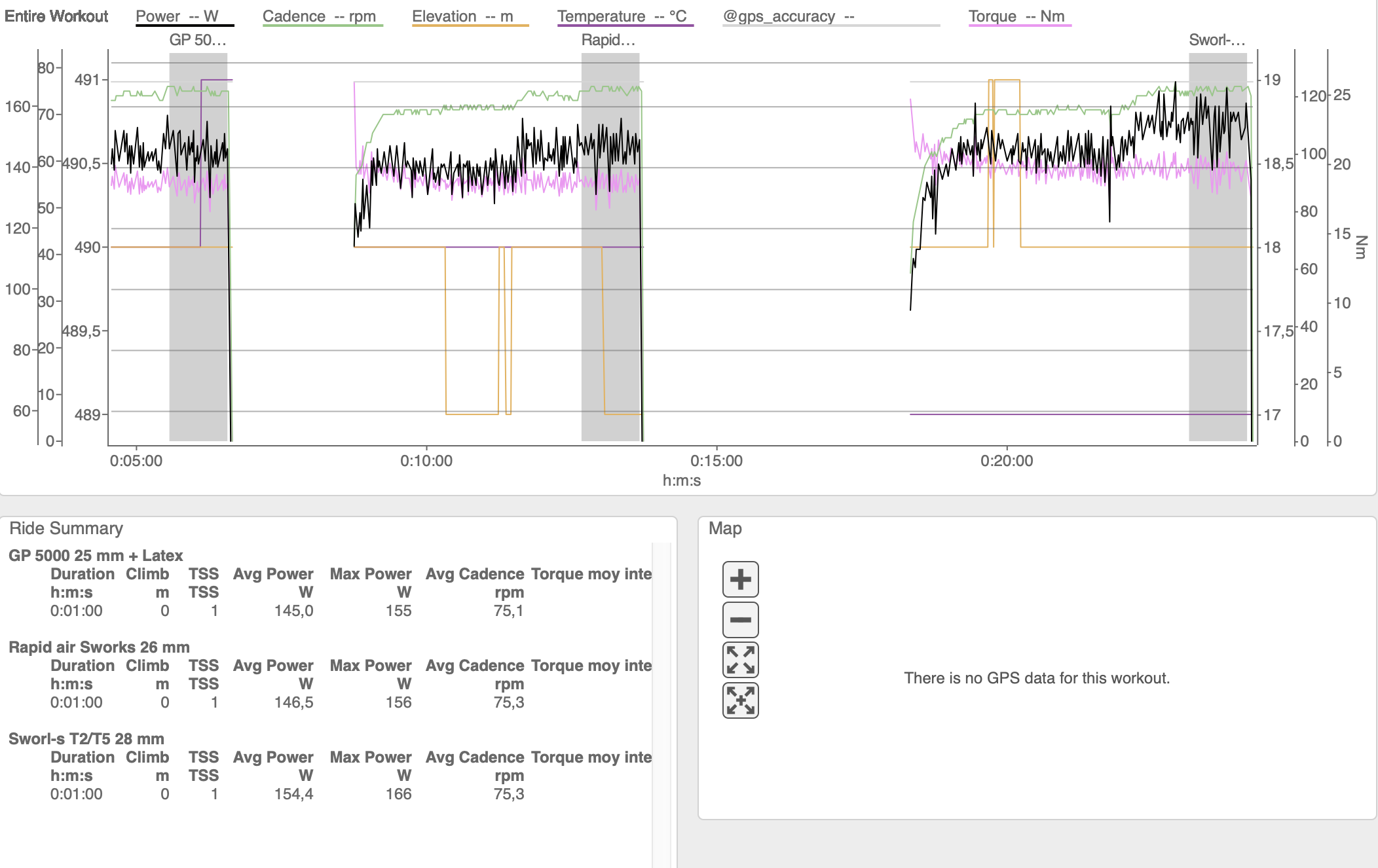 Mon pneu référence GP5000 + caa Latex est utilisé en premier puis est mesuré le Rapid Air 26 mm puis le Turbo de 28 mm. L’étanchéité étant très bonne du premier coup, je n’ai pas mis de liquide pour le test. Il faudra rajouter + 0.5 w à 30 kmh,+ 0.7 w à 45 km avec 20 ml de liquide / pneu comme déja rappelé grâce au test Aéro coach réalisé pour une paire de roue à 45 km/h:
