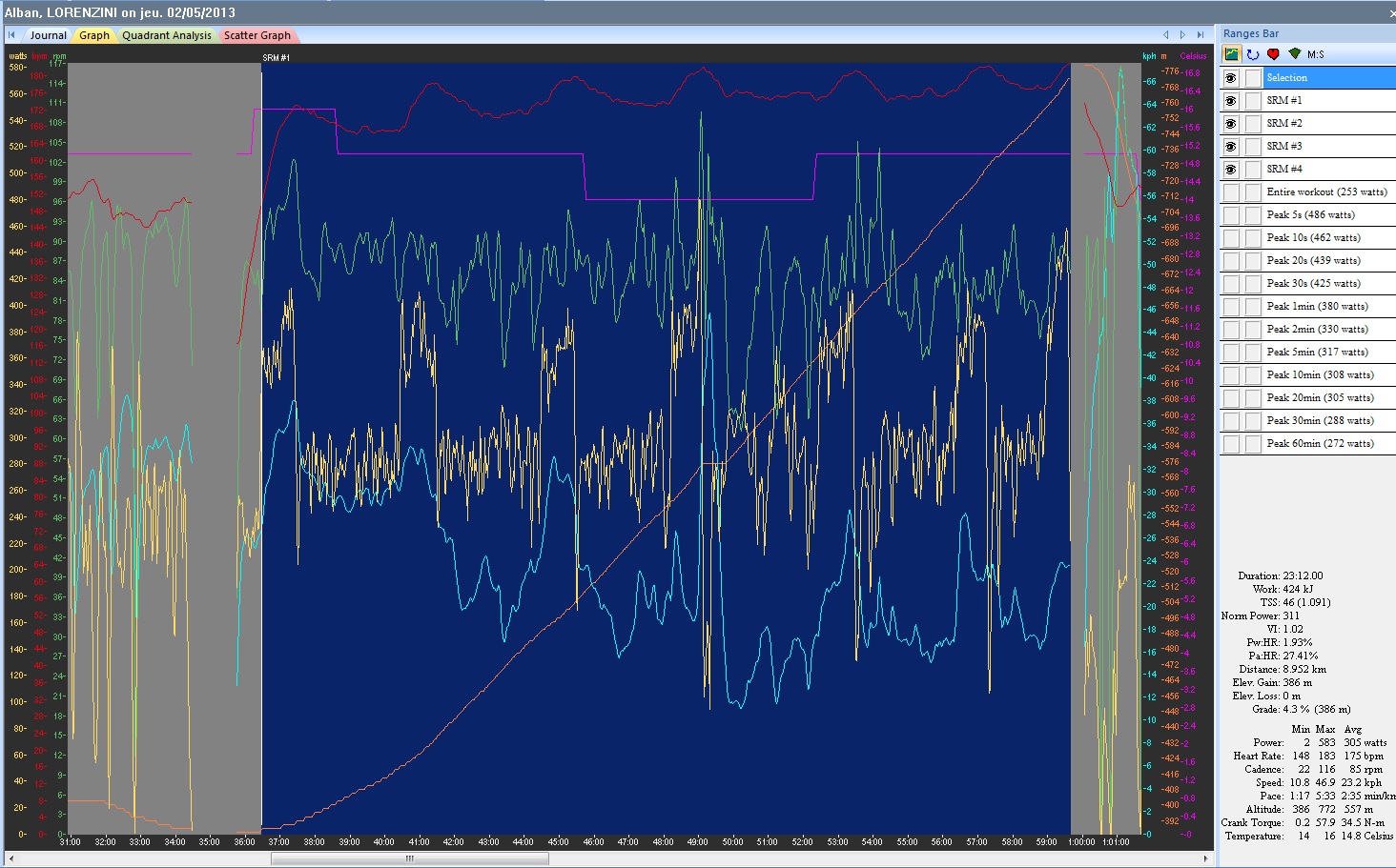 Pourtant je suis sur que ma PMA et FTP ne sont pas plus haut qu’en 2012 pour le moment. Dès que je dépasse 290w je suis rapidement dans le dur ! Il me reste donc un dernier cycle de 4 semaines à effectuer avant la Time pour faire monter SV2: Gimenez, exo @105 /110% de FTP vont être souvent de la partie. A voir maintenant si je vais pouvoir assimiler ce dernier bloc. Actuellement j’estime à 315w un cp20 suite à un exo de 23 min @311w réalisé le 02/05 où j’ étais pas loin de mon max. On verra d’ici un mois où j’en suis.