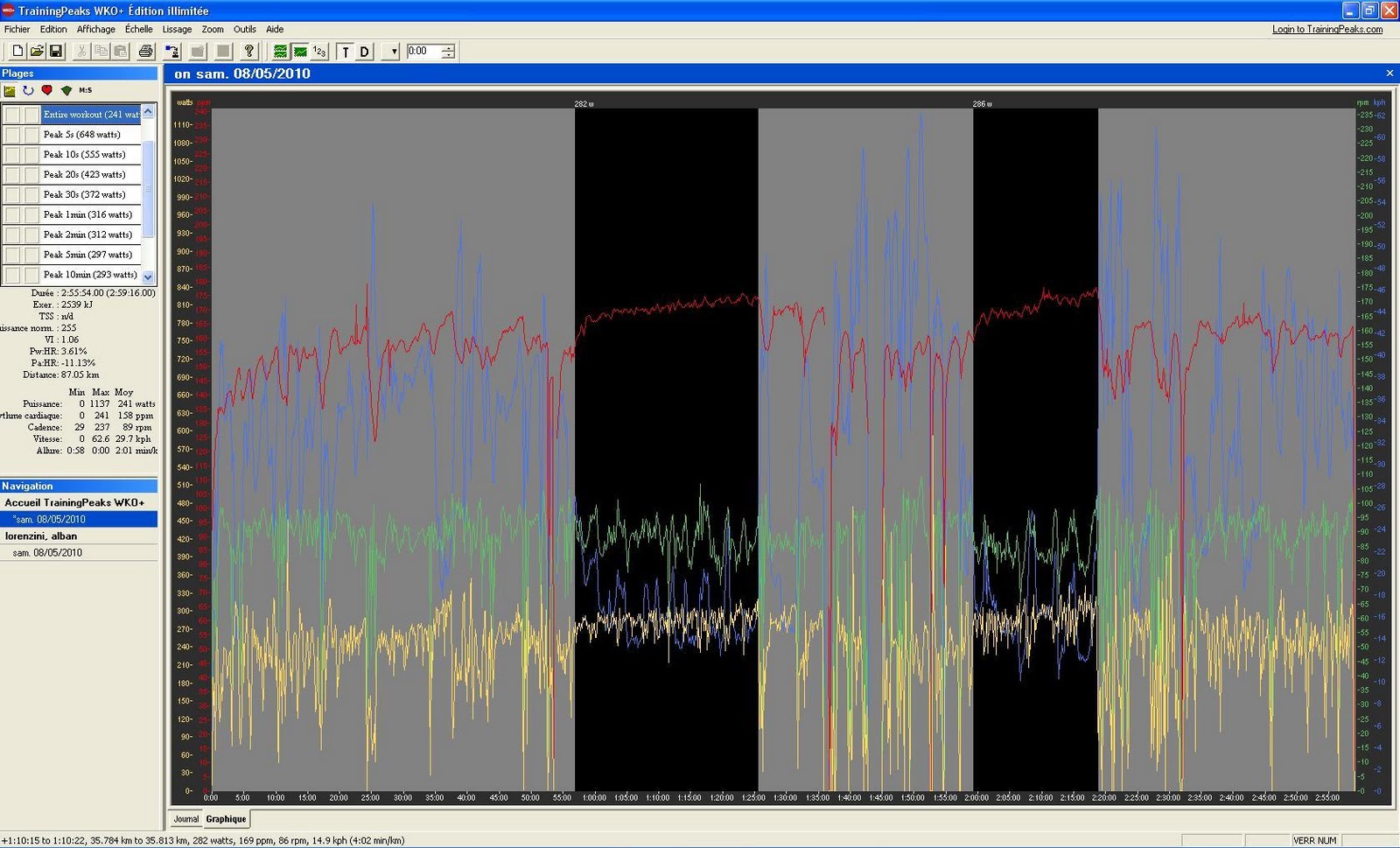 Commençons par un retour sur une semaine bien triste question météo et forme. J’ai trainé toute la semaine ma crêve et elle commence vraiment à partir depuis hier. Rien de bien méchant mais juste de quoi polluer toute activité sportive digne de ce nom. Le nez qui coule, les bronches bien encombrée dès que l’intensité monte bref combiné avec une météo désastreuse, voilà une semaine a oublier bien vite.Le TSS/D s’effondre à 50 pour la semaine, misère. Malheureusement la semaine qui vient ne présage rien de bon non plus pour les sorties. Toujours de la pluie et des orages au programme pour 7 jours. Alors oui peu d’impact pour les sorties courtes réalisables sur home trainer mais quid des sorties longues ? Je n’ai jamais fait aussi peu de longues sorties depuis bien longtemps et ma planif prend l’eau comme ma pelouse en ce moment. Finalement cela m’aurait bien arrangé que la Time soit une semaine plus tard comme l’année dernière car je commence à compter sérieusement les semaines restantes. Samedi il y avait heureusement une fenêtre météo à ne pas rater : pensez donc des éclaircies et 16 °C au programme, du jamais vu depuis 10 jours ! La stratégie du jour était la suivante : reprendre la forme en deux étapes. 40 km tranquille que j’allais réaliser avec ma femme puis 90 km 1600 m de D+ en montagne. Avec ma femme, j’ai roulé devant sur du plat nous permettant de maintenir une allure raisonnable. Bilan 1h15 à 160 w moy-180 w NP. Puis je repars seul dans l’optique d’essayer de maintenir une bonne moyenne. Le début n’est pas glorieux et je sens bien que les jambes ont besoin de se décrasser passé 250w. Mais au bout de 30 min, ça commence à aller mieux. Je prends donc le pari que mes bronches vont tenir et part pour les 2h30 restant en mode home trainer : c’est-à-dire en essayant de maintenir 270 w le plus longtemps possible et en limitant au maximum les temps de roue libre en descente. Le viel armand ( 600mD+) se profile vite et je le monte au train en essoufflement contrôlé. Bonne stratégie car je sens qu’il ne faut pas monter plus vite, les bronches me rappellent de temps en temps par quelques toux qu’il ne faut pas pousser !! Bilan 29 min @ 280w. Au sommet le ciel est déjà couvert et je prends même quelques gouttes.