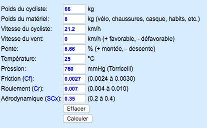 Comme le rappel Tour int dans son dernier numéro, les résistances à vaincre en côte sont du aux poids du coureur et de son vélo, à la résistance au roulement, au vent et aux pertes par friction. Je pars sur un jour sans vent pour simplifier