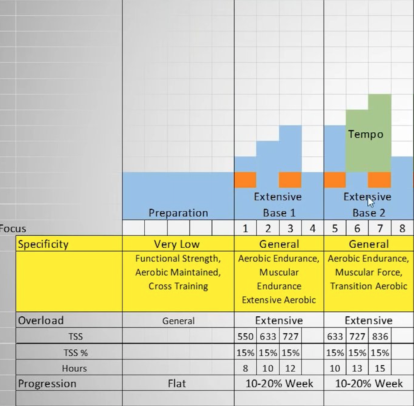 Phase BASE 1 et 2 aérobie / tempo majoritaire ( copyright Training peaks) |