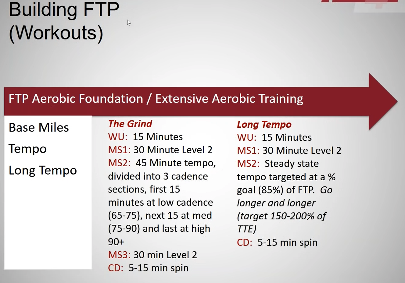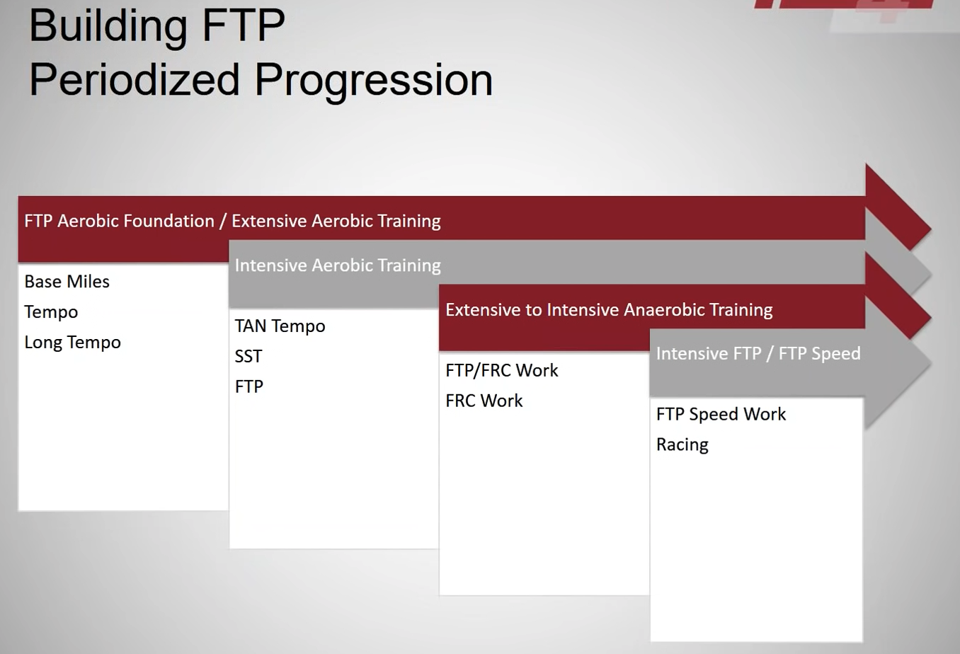 Bonjour, Base aérobie puis FTP puis PMA, c'est ce qui donne les meilleurs résultats. RIen n'empêche ensuite de refaire un cycle de FTP comme préconisé plus haut dans l'illustration de la maison. sportivement.
